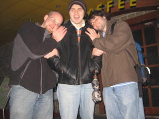 Sunday we had our weekly meeting and then in the afternoon I went to teach English to the people who teach me wushu. (We pay each other with our respective teaching.) At 5 a bunch of us went to KTV. The K stands for karaoke, which is the unofficial pastime of China. We got an awesome room that had English lyrics that were mostly correct. Whitney Houston was singing some song about "blittersweat memories" but other than that it was just about right. My favorite was John dancing to "My Humps" (which is not a good song when you actually have the lyrics on the screen by you, be warned). I was devastated that we didn't discover the switch to turn on the strobe light until we were leaving, though. I could have practiced pretending to have dancing ability some more. Here you can see William and me holding on to John in front of a coffee/KTV place. It was actually the wrong place so were really just totally confusing the ladies in charge of opening the door and yelling welcome. They couldn't figure out if we were coming in or not, then we ended up walking down the street to the right place. Oops.
